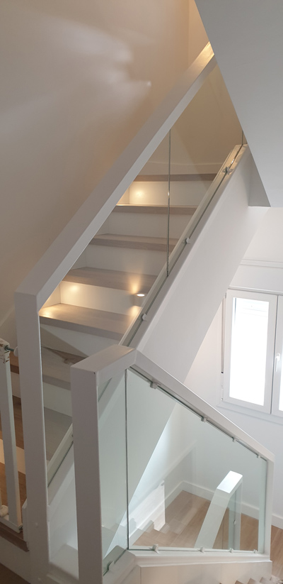 Se han utilizado materiales porcelánicos dando mucha importancia al acero y vidrio para separar estancias. También utilizados en la escaleras.