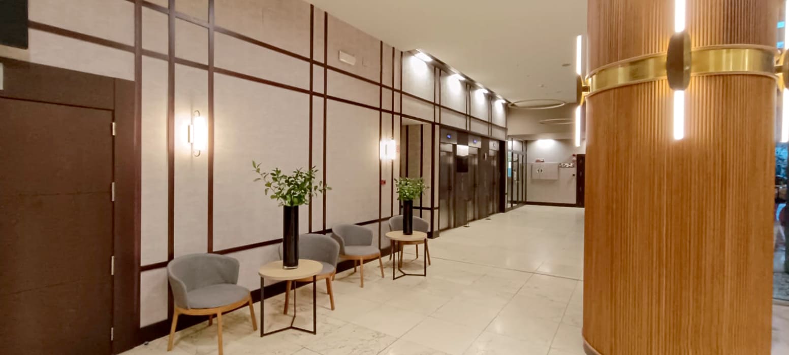 La zona de lobby se hace más funcional y confortable. Se utilizan moquetas para dar calidez, madera en muebles y una gran iluminación suspendida del techo.